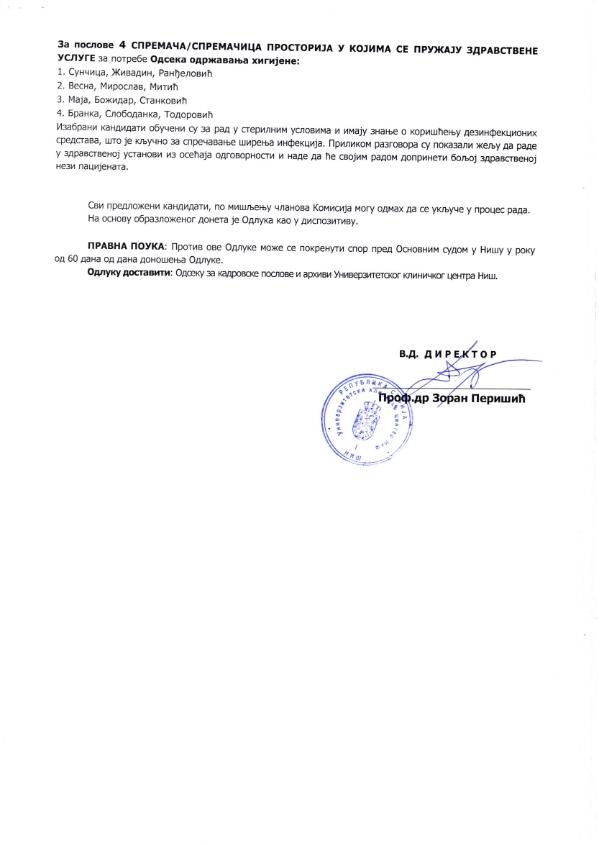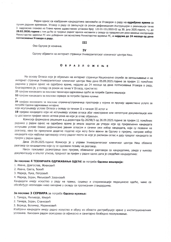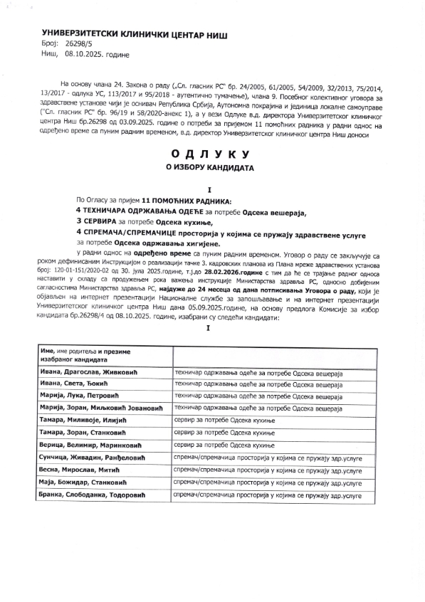 ОДЛУКА о избору кандидата за пријем 11 помоћних радника