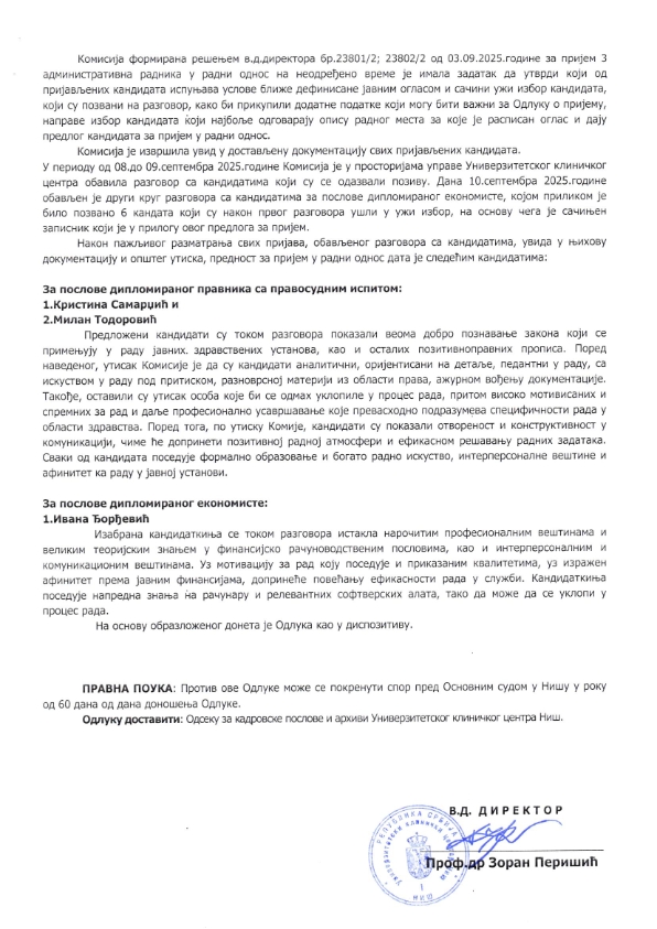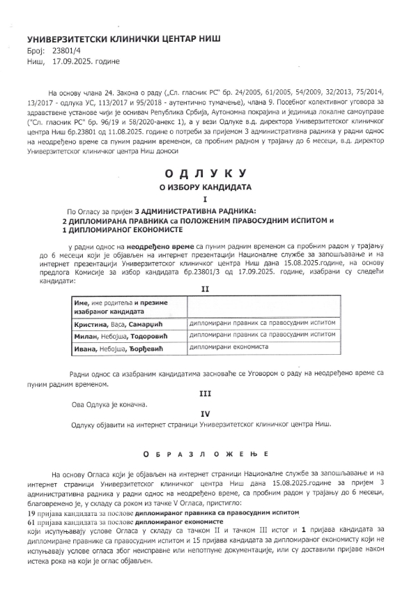 ОДЛУКА о избору кандидата за пријем 3 административна радника на неодређено време 04.02.2026 Подели оглас: