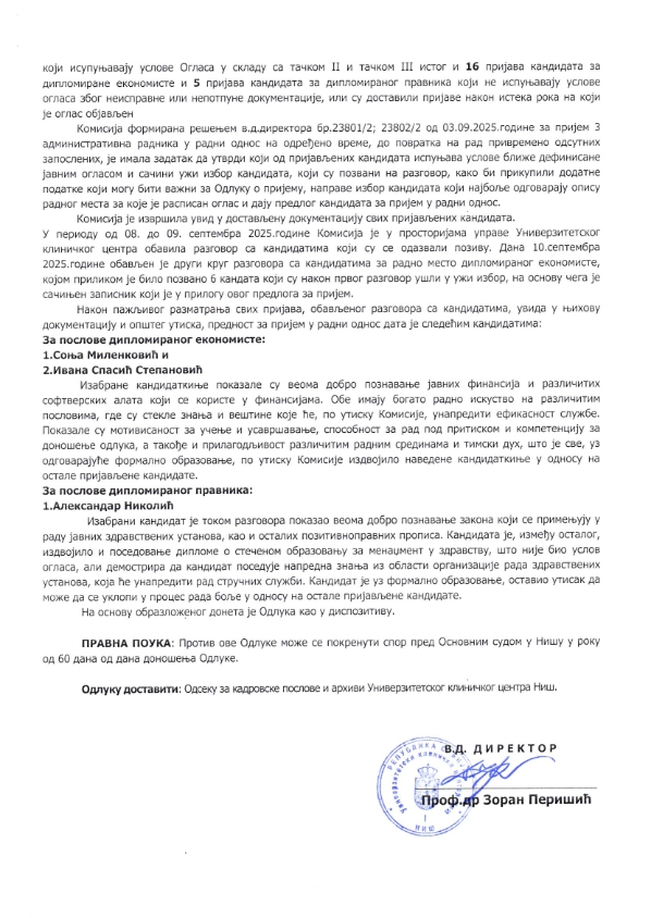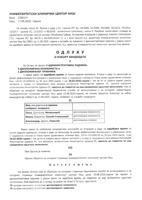 ОДЛУКА о избору кандидата за пријем 3 административна радника на одређено време 18.09.2025 Подели оглас: