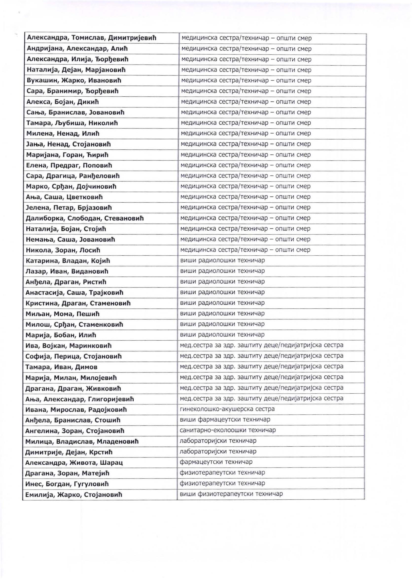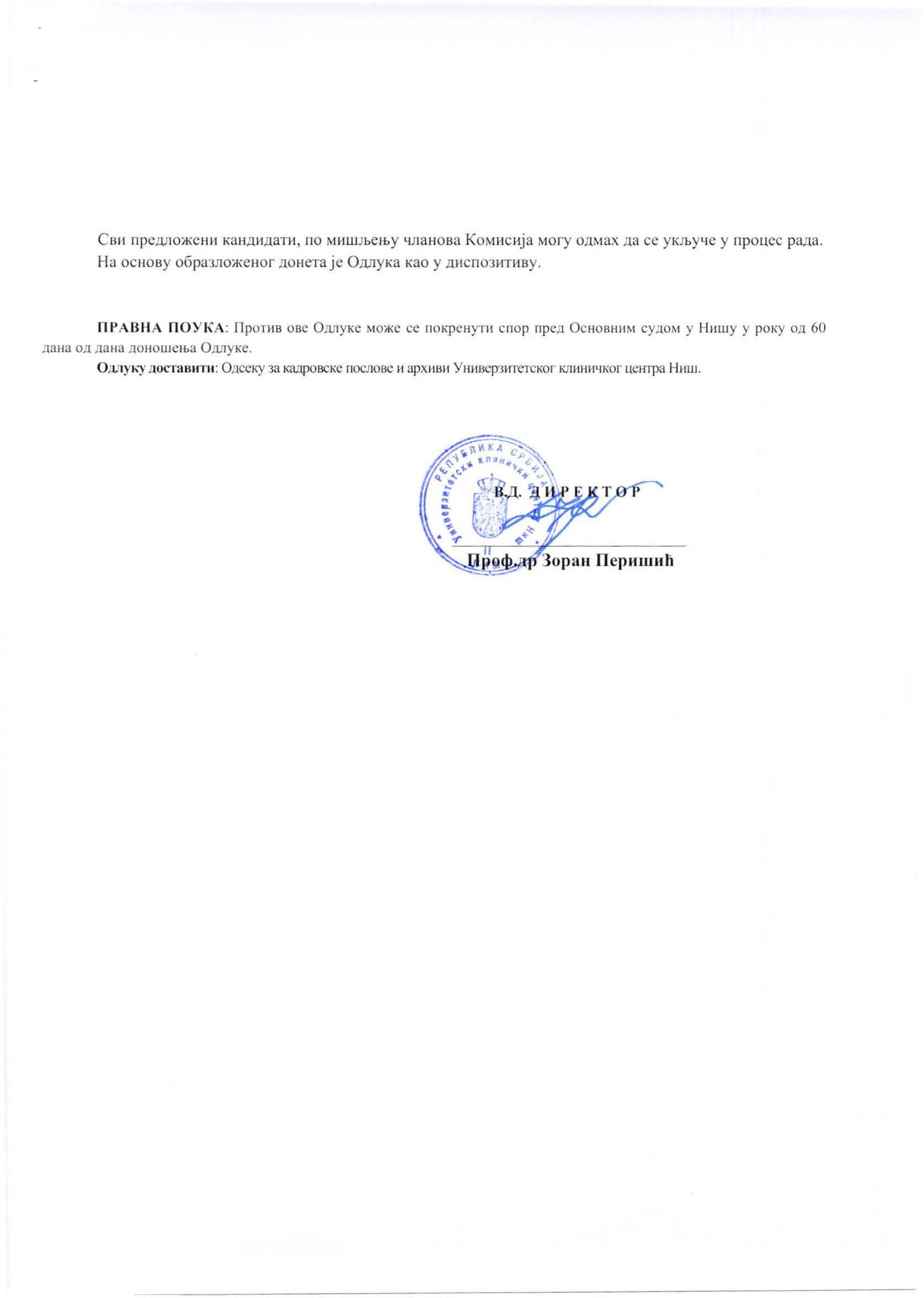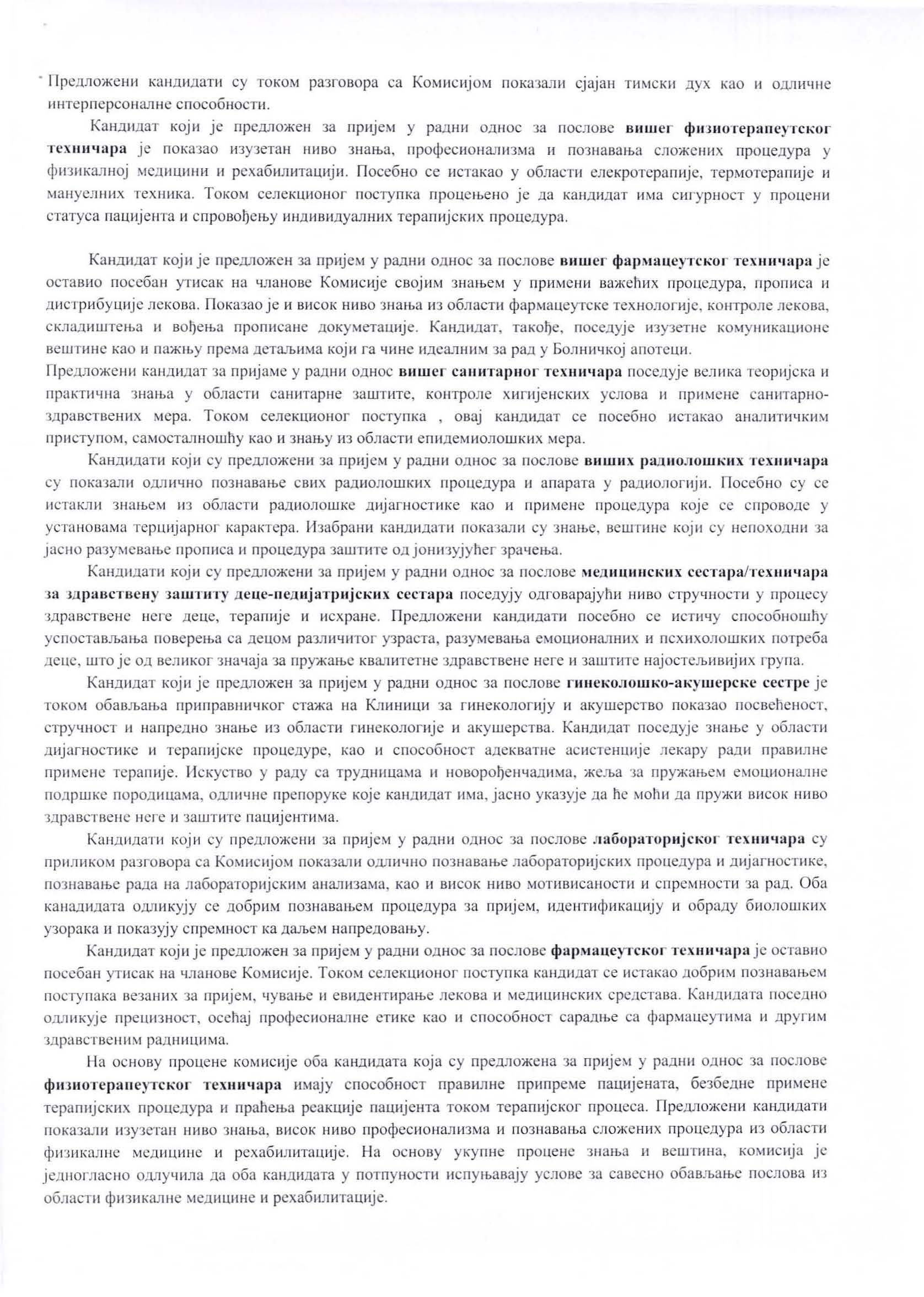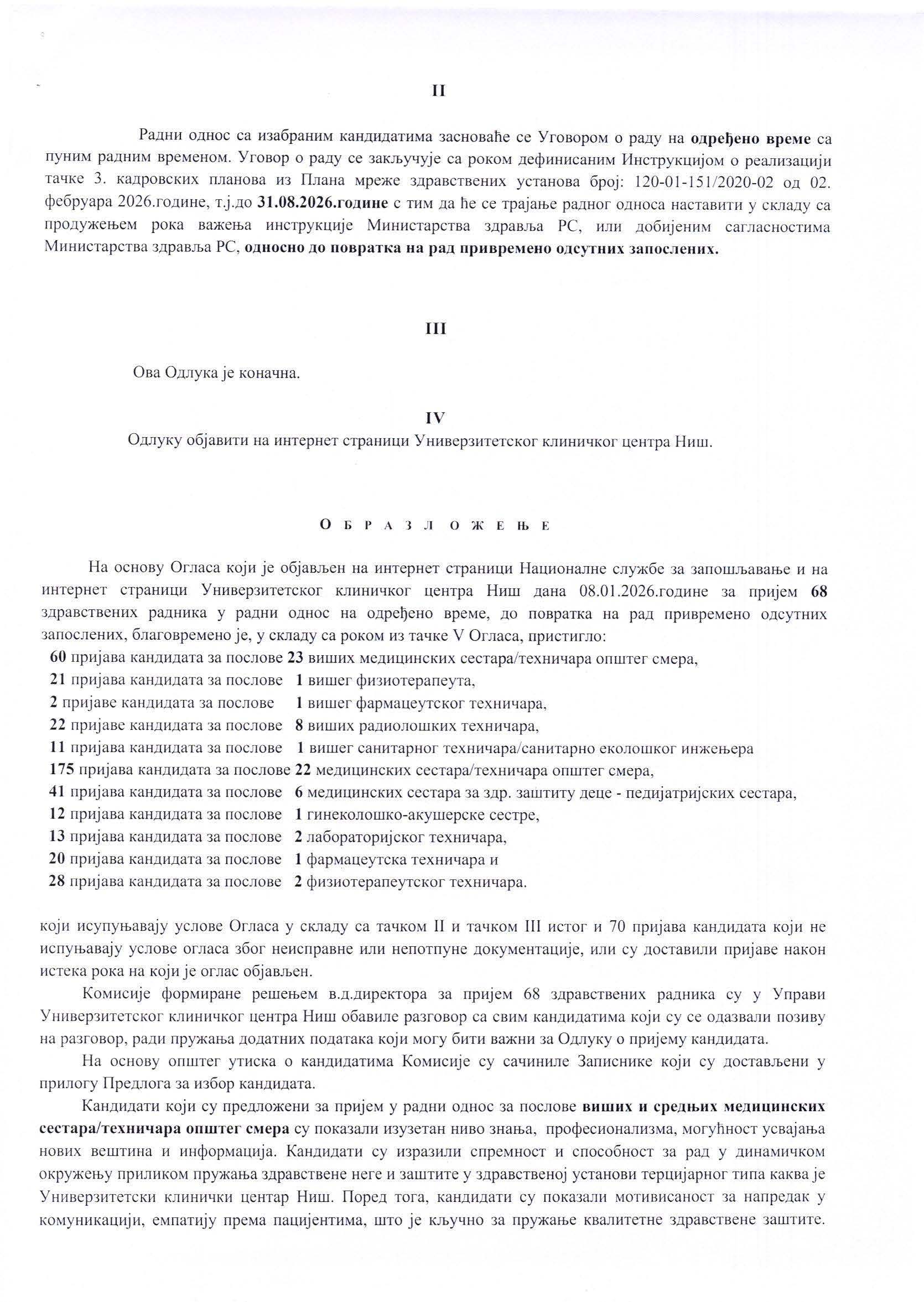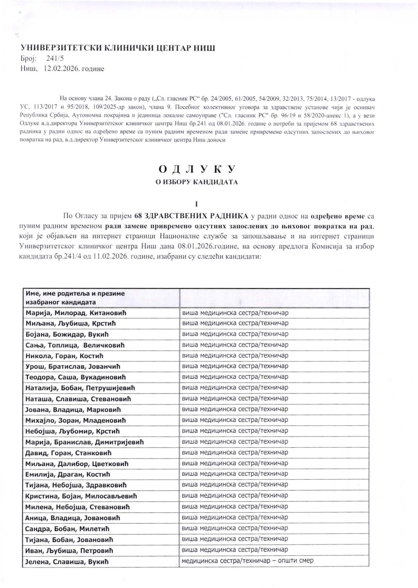 ОДЛУКА о избору кандидата по огласу за пријем 68 здравствених радника